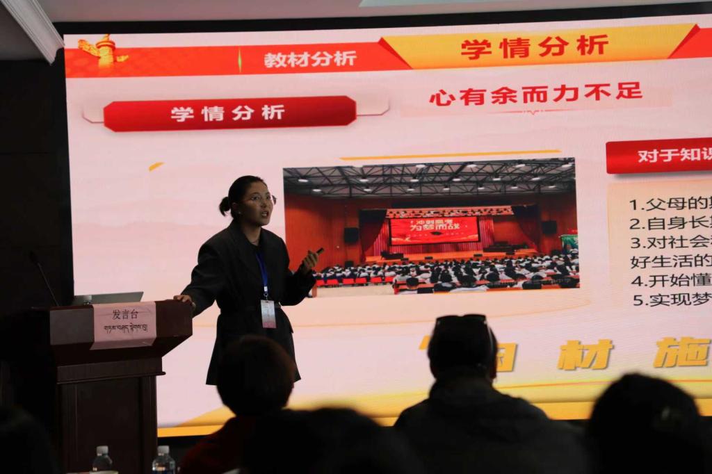 说课展示环节,来自全区各地市教育局、大中小学的各学龄段代表进行说课展示,呈现各学段思政课的特色与创新,集中展现一体化建设的教学成果。西藏民族大学马克思主义学院讲师陈舒霄围绕高中学段思政课教学设计,突出议题式教学与真实情境创设,引导学生在思辨中深化对社会议题的理解,提升高阶思维能力。拉萨市第一小学教师小央金卓嘎通过生动的教学案例,呈现小学阶段“启蒙性”思政教育的实施路径,以童言童语讲好中国故事,体现“润物细无声”的育人理念。林芝市八一中学德育处副主任李燕聚焦初中阶段价值引导,采用项目式学习方式,组织学生开展社会调研与公益实践,有效提升社会责任意识与行动能力,获得与会人员高度评价。