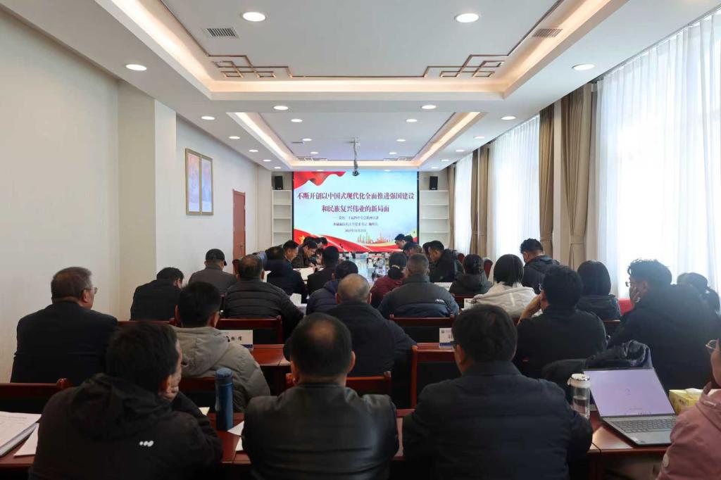 11月20日下午,学校召开党委理论学习中心组2025年第七次学习(扩大)会议,校党委书记鞠明兵作党的二十届四中全会精神宣讲,进行全会精神专题学习研讨。学校党委班子成员王斌礼、黄国慧、边巴仓决、多杰仁青、达罗、尼玛普赤出席,全校县处级以上领导干部、各直属科级部门负责同志参加会议。