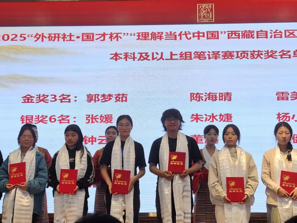 2025年11月1-2日由西藏自治区教育厅主办的2025年“外研社·国才杯”“理解当代中国”西藏自治区大学生外语能力大赛决赛在西藏大学举行。参与决赛的学校为西藏各高校具有高等学历教育招生资格的普通本专院校在校专科生、本科生、研究生(不包括在职研究生)。基础部主任翟新然副教授代表学校参加颁奖典礼。本次比赛分本科及以上组与高职高专组两个组。我校带队教师为语言教研室英语组次仁旺堆副教授,经前期校赛选拔出9名同学进入本次省级本科及以上组笔译和演讲决赛,参赛选手均为各高校英语专业和非专业选手。经过激烈角逐,我校学生获得了优异的成绩。其中获得金奖的丹增诺布同学有望代表西藏大学生参加在北京举行的全国国赛。